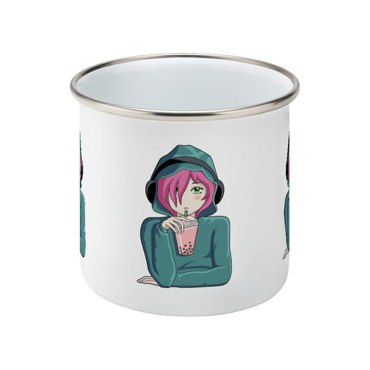 Anime Girl Drinking Boba Silver Rimmed Enamel Mug