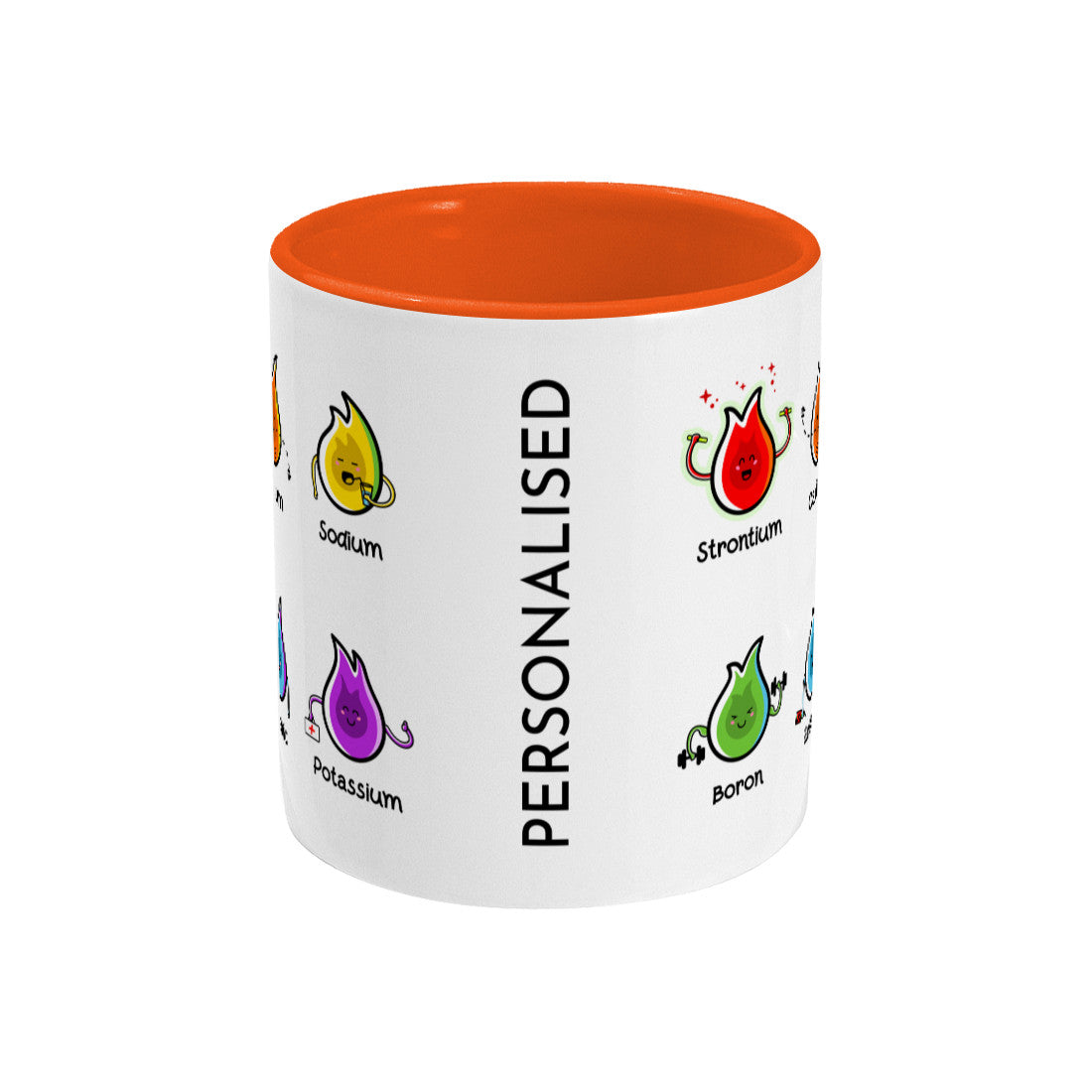 A two-toned ceramic mug illustrating how different elements burn with a different coloured flame – here’s some cute examples with some of their element’s characteristics. Great for chemistry teachers doing flame tests!