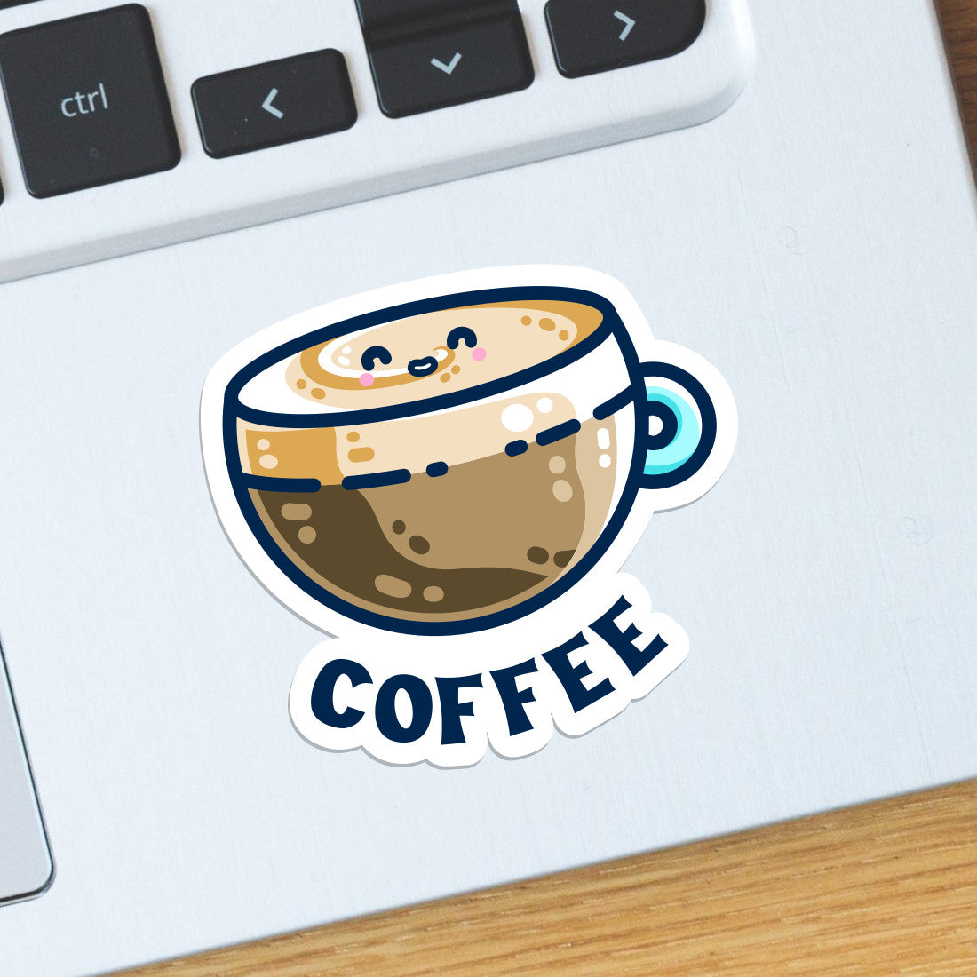 A kawaii cute creamy latte design with the word 'coffee' beneath, on a kiss-cut / die-cut vinyl sticker that follows the shape of the image.