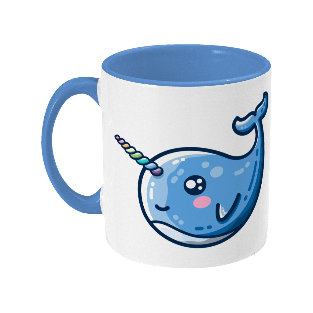 A kawaii cute narwhal, with a rainbow striped horn, on a ceramic mug.