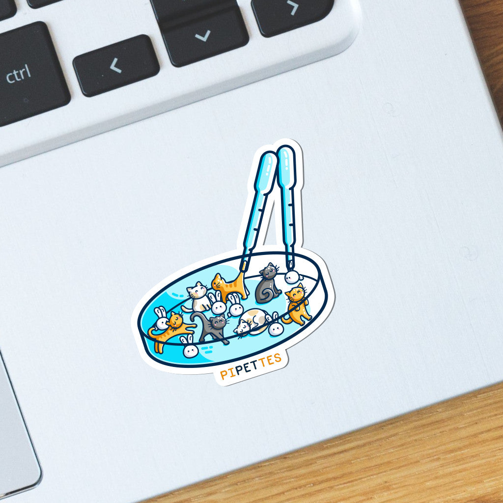 A science pun on the word pipettes. Cute cats and rabbits, representing the pets in the pun, have been tranferred to a petri dish using pipettes. On a kiss-cut / die-cut vinyl sticker that follows the shape of the image.